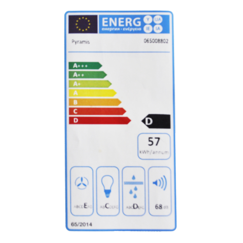 Каминният аспиратор 60 NN1 SU 32L на PYRAMIS е с модерен дизайн, мощност 1 x 90 W и максимален дебит от 630 куб.м/ч. Управлява се посредством потъващи бутони. Работи с два броя метални филтъра. Абсорбаторът е предназначен за монтаж на стена. Аспираторът е енергиен клас Е. Ширина 60 см, диаметър на въздуховода ф150 мм. Снабден е с удобно халогенно осветление.