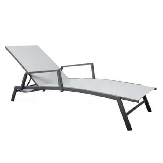 Градински шезлонг с подлакътници и регулируема облегалка. Шезлонгът е с размери 192 х 72 х 35см. Изработен е от метал и PVC плат. Основната метална рамка е с размери 40 х 20 х 1мм и 27 х 15 х 0.9мм.