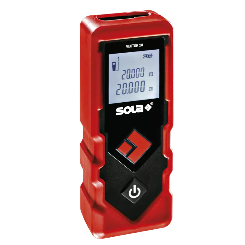 Лазерната ролетка Vector 20 на SOLA е лесна за използване, с мек захват и ергономичен дизайн. Захранва се с 2 х 1.5 V AAA батерии. Обхвата на измерване на модела е от 0.2 до 20м. Притежава клас на защита IP42 и двулинеен дисплей с подсветка. Максималното отклонение при измерване е ± 2мм. Размерите на ролетката са 100 х 38 х 24мм. Изключва се автоматично, като по този начин пести батериите. Работното време на батериите при 20°C е 5000 измервания.