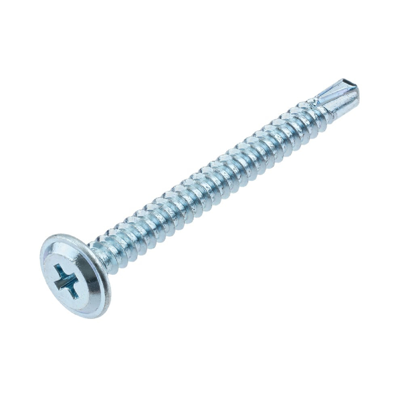 Самопробивен винт за метал DIN 7504T с полуобла, скосена глава, вградена шайба и връх със свредло.