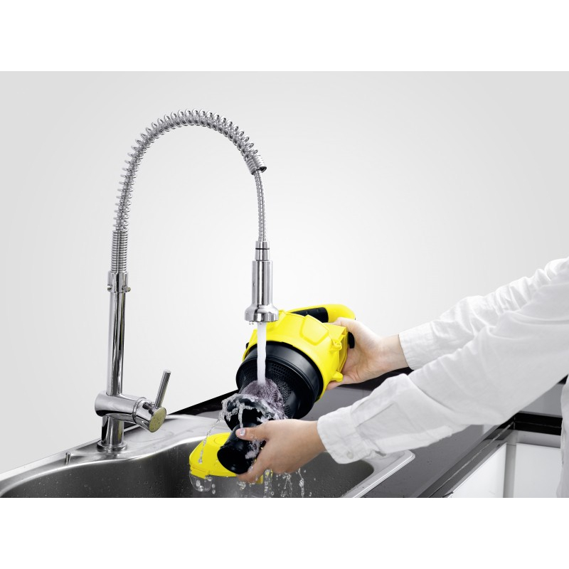 Елегантната и компактна прахосмукачка с колела VC 3 на KARCHER с мултициклонна технология позволява изсмукване изцяло без филтърна торбичка. Това спестява смяната и допълнителното закупуване на скъпи филтърни торбички. Нейният прозрачен контейнер за отпадъци освен това показва от пръв поглед кога трябва да бъде изпразнен.