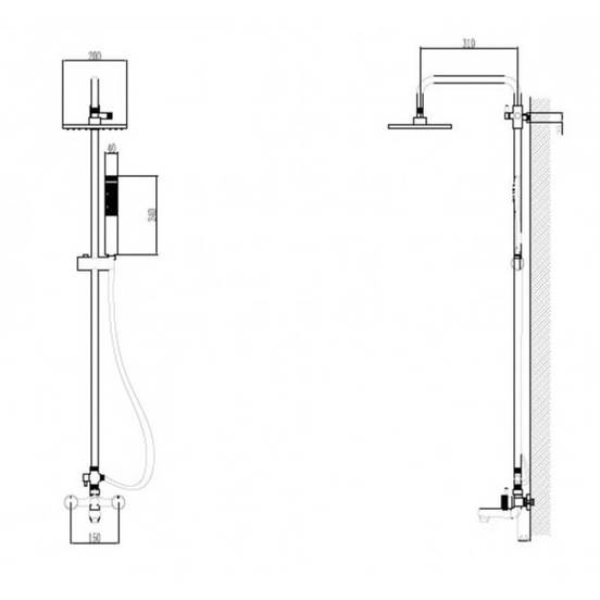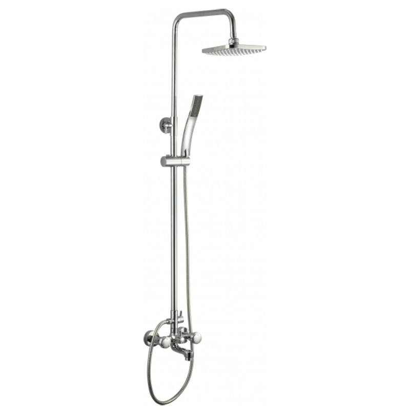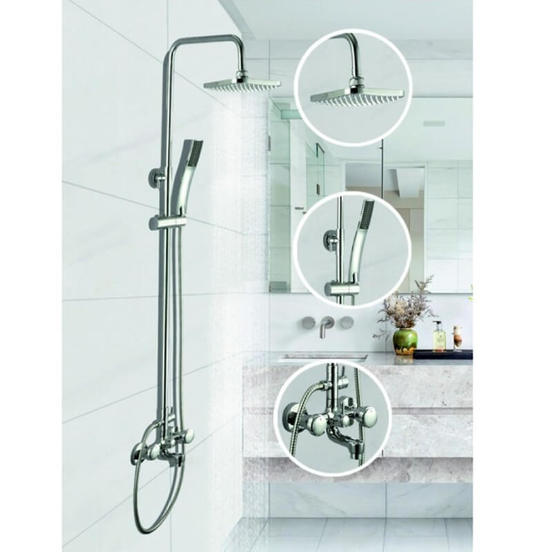 Телескопично тръбно окачване в комплект със смесител за вана/душ, квадратна душ глава и подвижен ръчен душ.