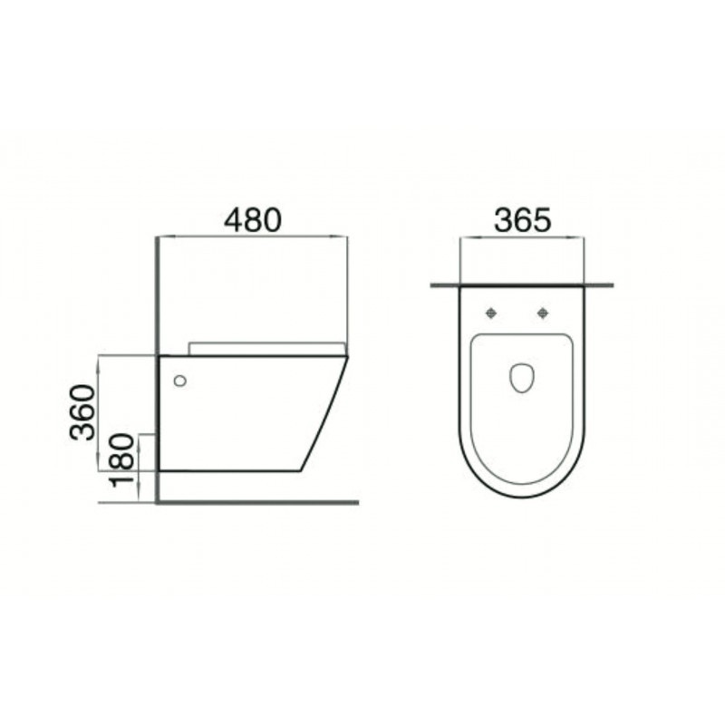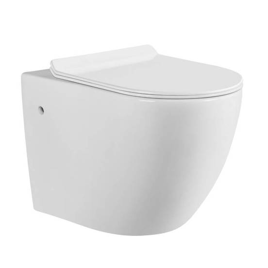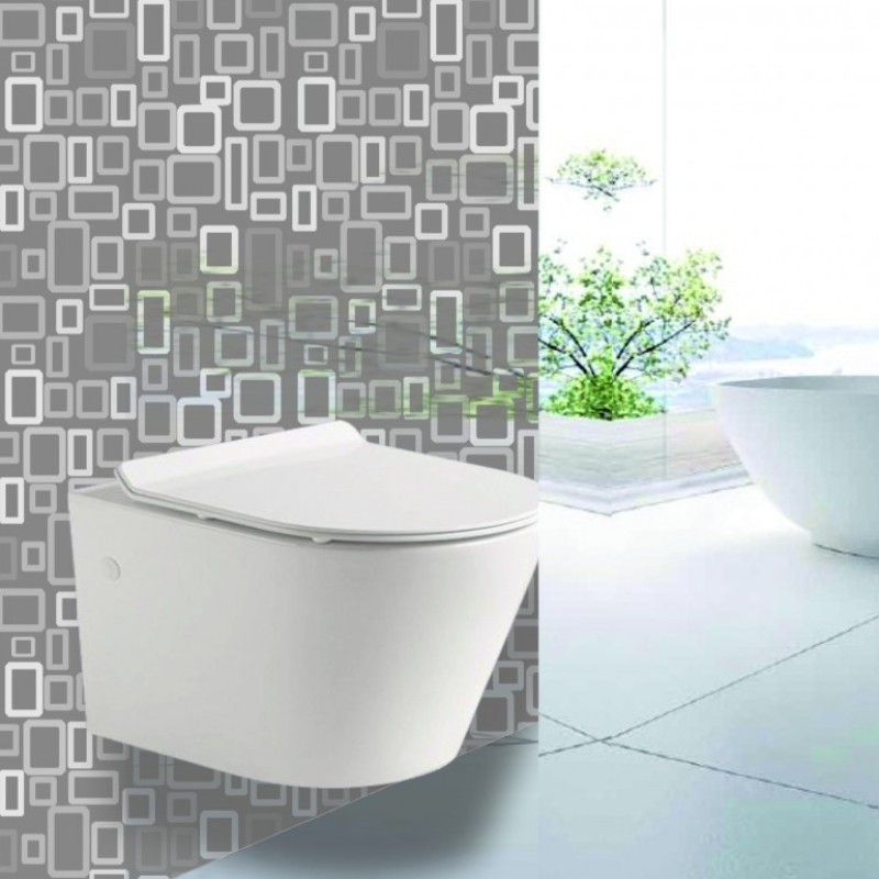 Порцеланова тоалетна чиния от серията Rimless на марката INTER CERAMIC. Предназначена за стенен монтаж. Окачената тоалетна чиния е с ултра тънка тоалетна седалка от дуропласт с механизъм за забавено падане.