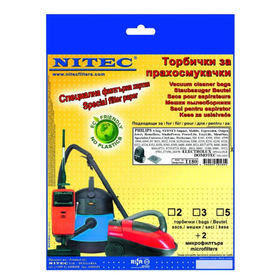 Торбички за прахосмукачки T180, на марката NITEC, отличаващи се с 50% по-дълъг експлоатационен живот. Комплектът включва 3 торбички плюс 2 два микрофилтъра. Тези прахоулавящи торбички са специално изработени за модели прахосмукачки на няколко марки: AEG, DOMOTEC, ELECTROLUX, PHILIPS, PROGRESS, ZANUSSI.
