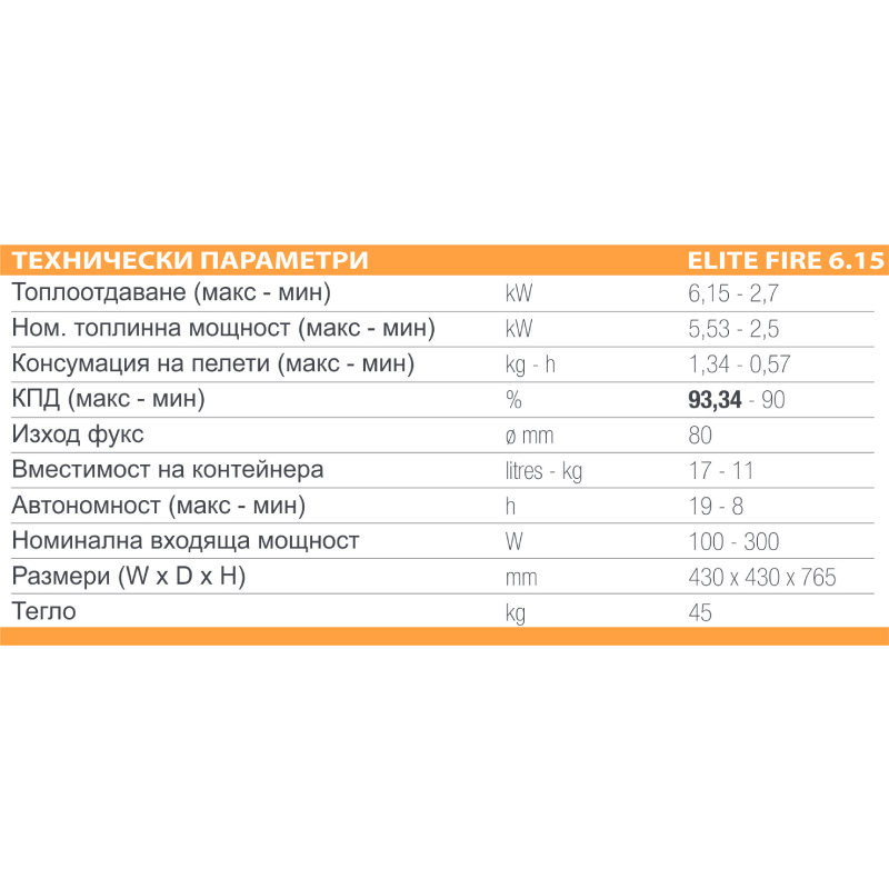 - Консумация на пелети: 0,57-1,37 кг/ч