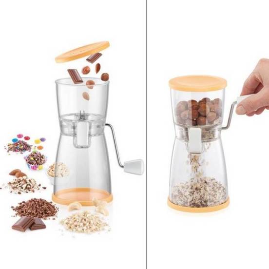Ръчна мелничка за ядки, шоколад, бисквити и други. Произведена е от меръждаема стомана и устойчива пластмаса. Снабдена е с основа, която не позволява хлъзгане.