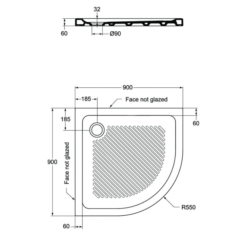 Керамично поддушово корито с размери 90 х 90 см, височина 6 см и дълбочина 3 см. Поддушовото корито разполага с отвор за сифон с размер ф90 мм.