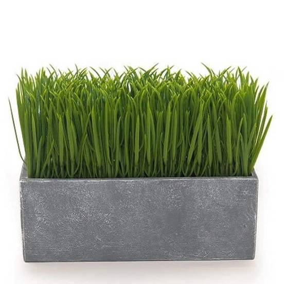 Пласмасова правоъгълна кашпа с изкуствена трева, подходяща за аранжиране на маси, витрини и други.