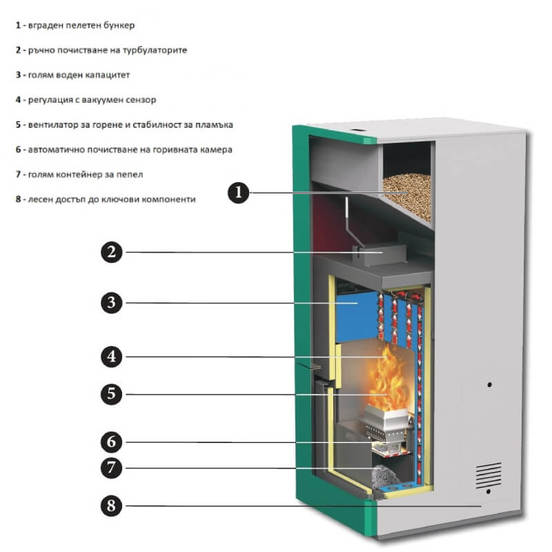 Котелът е разработен за работа само на пелети. Благодарение на автоматизираната самопочистваща система, подръжката е минимална. Имат възможност за връзка с прецизен стаен термостат, което гарантира перфектното регулиране на температурата в дома. Вакуумен сензор оптимизира процеса на горене и влияе на температурата на водата. Високотехнологичните производства на Mareli Sistems, са гаранция за покриване на най-високите нормативи, свързани с количеството на отработените газове.