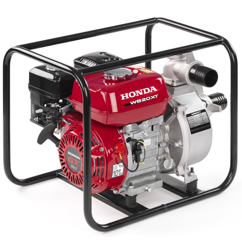 Моторната четиритактова помпа WB20XT3 на HONDA притежава високонадежден бензинов, четиритактов двигател HONDA GX120Т3 използващ изключителния дизайн на висящите клапани. Тази конструкция на модела позволява по-голяма изпомпваща мощност и 30% по-голяма икономия на горивото, в сравнение с двигател със странично разположени клапани. Освен двигателя, надеждността на HONDA обхваща и корпуса на помпата. Здравите витла от лята стомана и механичните спойки гарантират години надеждна работа, като допринасят и за способността на помпата да поддържа максимален изпускателен обем.Помпата стартира бързо и лесно, благодарение на декомпресираща система и електронно запалване, неизискващо подръжка. Издръжливата конструкция, мощният двигател, бързото смукване на вода и лекото тегло на бензиновата помпа за по-лесна преносимост допринасят за възможно най-висока производителност. Модел WB20XT3 e подходящ за чиста вода и водни басейни.