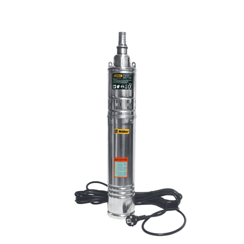 Потопяема дълбочинна помпа за чиста вода 0503WP020CRC на марката MOLLER. Помпата може да се използва за далечно хоризонтално транспортиране, напояване и пръскане, за зони с ниско водно равнище, високи сгради, фабрики и мини. Когато се постави регулатор на налягането, може да служи като автоматичен инструмент за напояване. Моделът изпомпва вода от дълбочина до 30 м, като препоръчителната дълбочина на поставяне е между 10 - 15 м за максимална ефективност. Височината на водния стълб е 50 м. Помпата притежава месингови намотки на двигателя, вградена възвратна клапа, иноксов корпус на турбината, което предпазва помпата от корозия в сондажа.