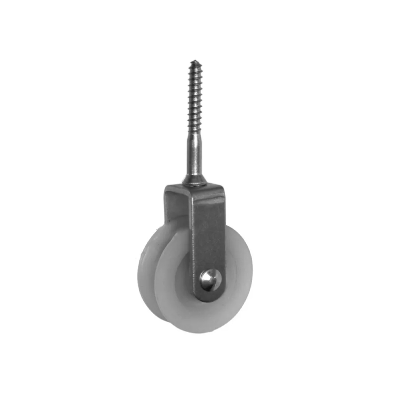 Здрава поцинкована макара с интегриран винт за дърво, предназначена за плавно водене и отклоняване на въжета. Подходяща за монтаж върху дървени повърхности и за различни битови, градински или работни приложения.