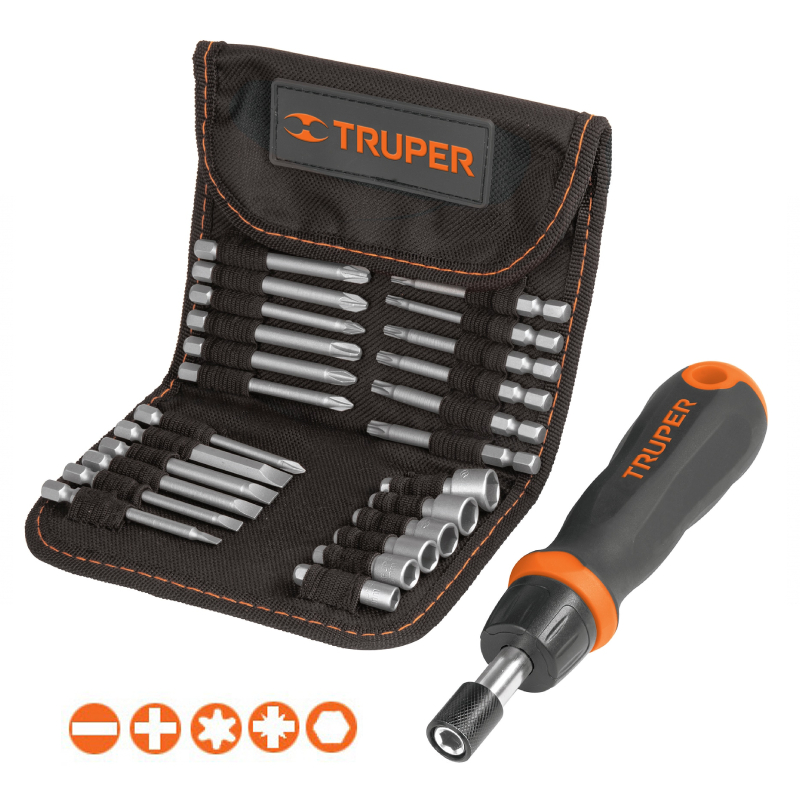 Комплектът на тресчотка с битове на TRUPER се предлага в удобен калъф, който позволява и закрепяне към колан за лесно транспортиране. Реверсивната отвертка разполага с тресчотка и ергономична дръжка за повече удобство по време на работа. Характеризира се със 100% по-голяма устойчивост на въртящ момент 18 lb-ft. Дължината на тресчотката е 180мм, а присъединението й е 1/4". Комплектът се състои от 25 части. Връхчетата на битовете са ковани и изработени от хром-ванадиева стомана. Гнездата са ковани от хромирана стомана.