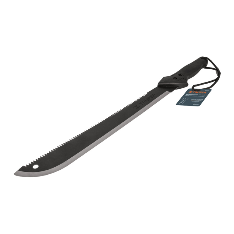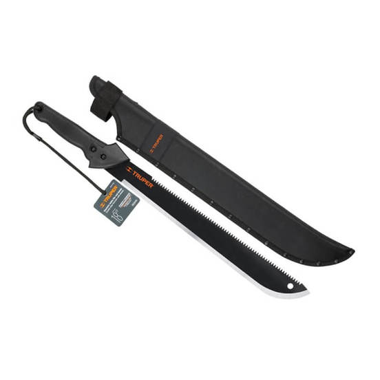Комбинираният мачете трион на TRUPER представлява мултифункционален инструмент, който може да се използва като нож и трион. Дължината му е 457мм/18". Зъбците са 5 броя на инч. Мачете трионът се предлага с калъв за лесно и безопасно транспортиране.