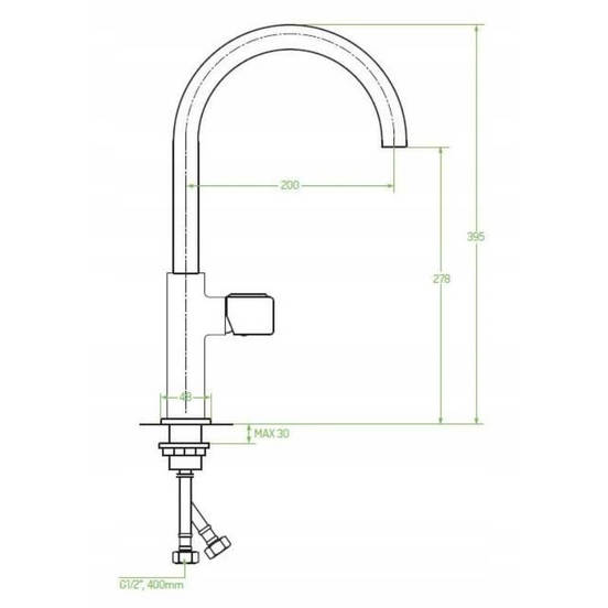 Кухненският смесител е едноръкохватков и с подвижен чучур. Притежава висококачествен керамичен затварящ механизъм. Изработен е от месинг със защитно покритие в цвят графит.