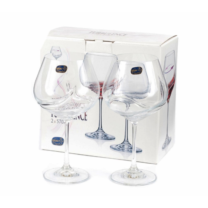 Чашите за червено вино на BOHEMIA, серия Turbulence са изработени от кристалиново стъкло за максимален блясък и звънкост. Калиевото стъкло кристалекс е без съдържание на олово и кадмий. Предлагат се в комплект от 2 бр, като всяка от чашите е с вместимост от 570мл. Отличават се с оригинален и елегантен дизайн. Подходящи са за почистване в съдомиялна.