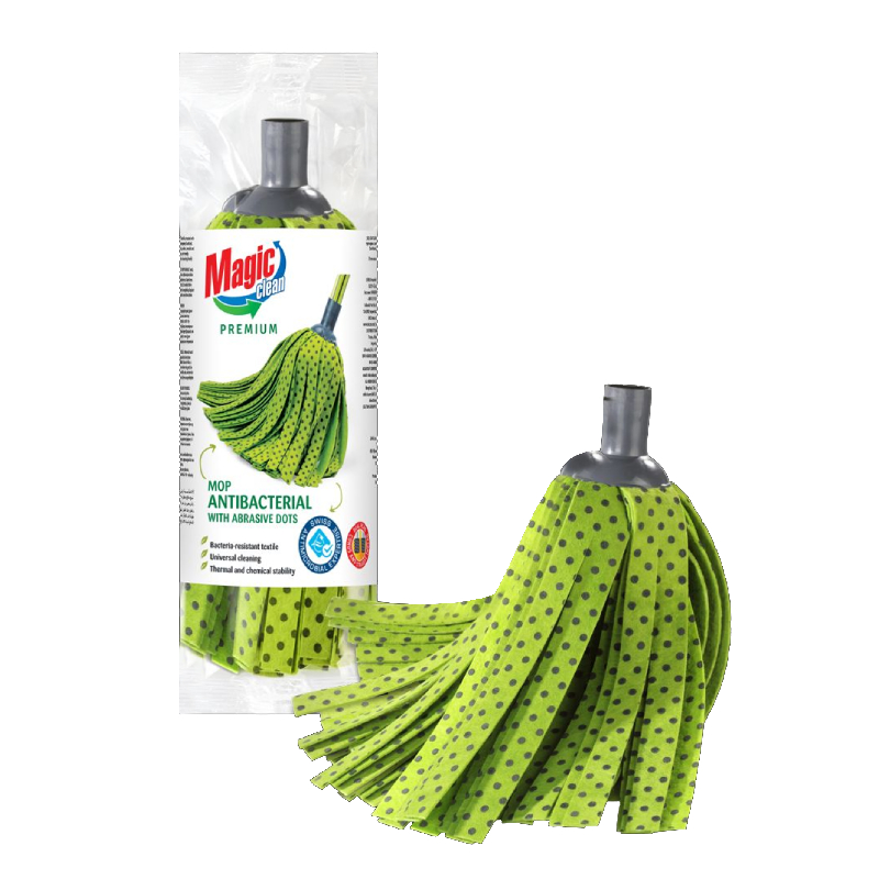 Универсалната бърсалка Premium Stirp Mop на MAGIC CLEAN се характеризира с високи абсорбиращи свойства, антибактериално действие и голяма издръжливост. Мопът е изработен от вискозни ленти. Почиства и изсушава ефективно всеки тип подова настилка, без да оставя следи. Конусканата, права резба е универсална.