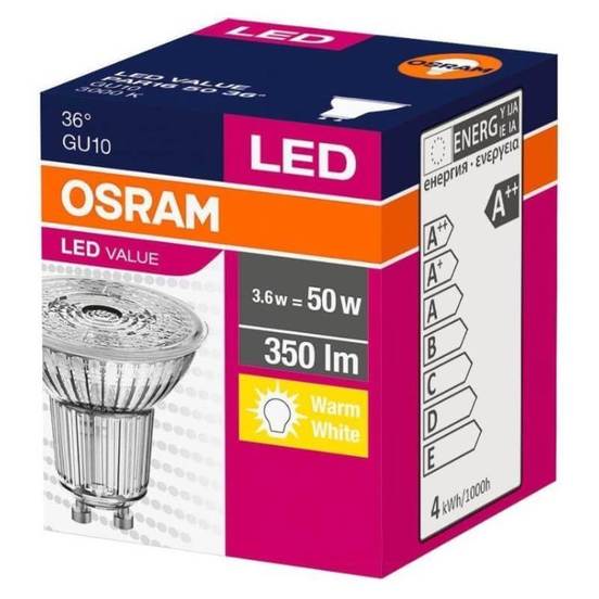 Енергоспестяваща LED лампа OSRAM с насочваща светлина. LED лампата е с мощност 4.3W (еквивалент на 50W крушка с нажежаема жичка), цокъл GU10 и светлинен поток 350lm.