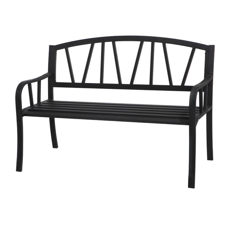 Градинска пейка с облегалка и подлакетници, произведена от метал. Подходяща е за поставяне на открито в паркове, градинки и други обществени пространства.