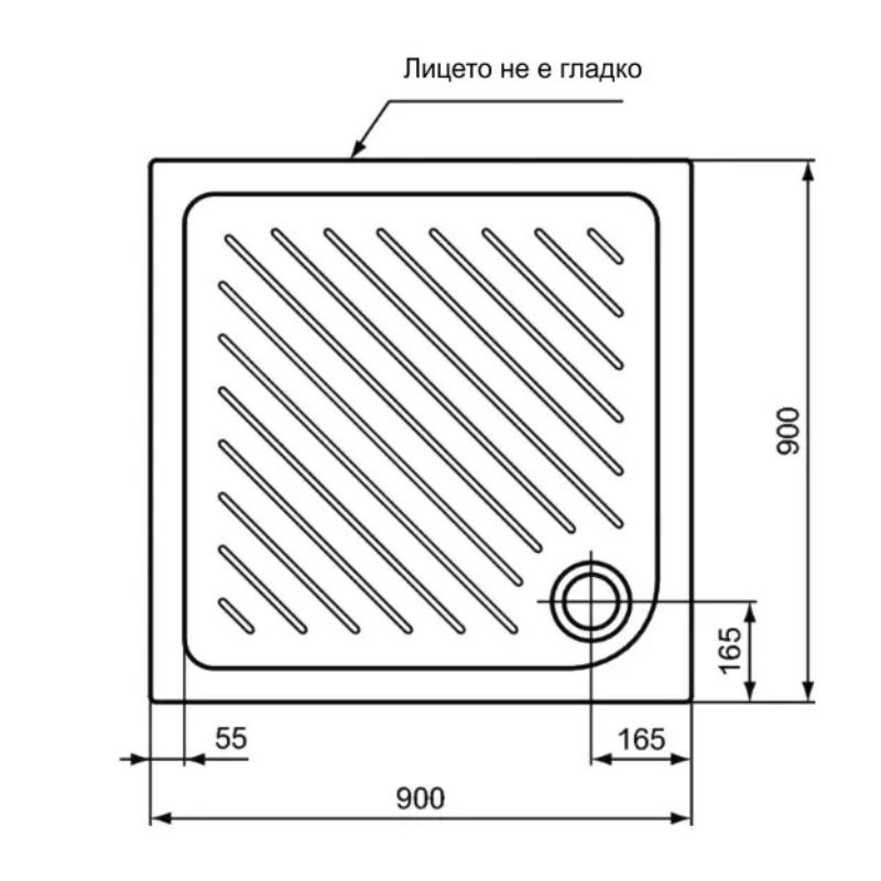 Акрилно поддушово корито с размери 90 х 90 см, височина 7 см и дълбочина 4 см. Поддушовото корито разполага с отвор за сифон с размер ф90 мм, който е разположен в най-далечната точка от стената.