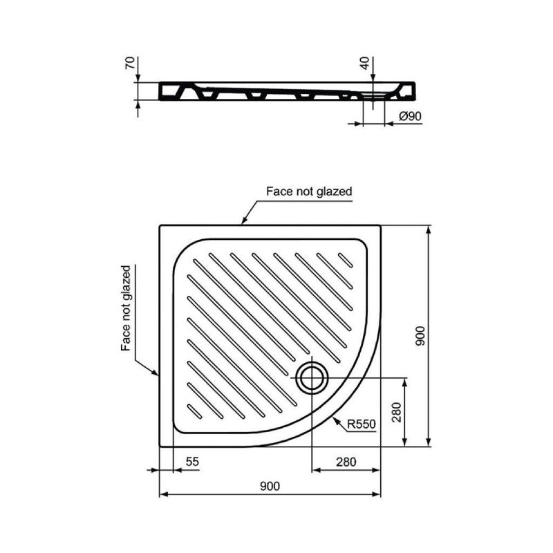 Керамично поддушово корито с размери 90 х 90 см, височина 7 см и дълбочина 4 см. Поддушовото корито разполага с отвор за сифон с размер ф90 мм.