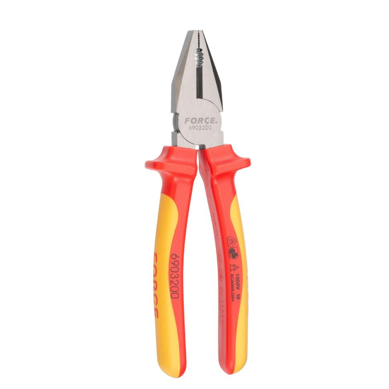 Универсални клещи изолирани VDE 1000V на марката FORCE. Професионален инструмент за електротехници. За работа под напрежение до 1000V. Клещите са с дължина 180мм. Моделът разполага с удобни ръкохватки против хлъзгане. Инструментът е съобразен с международните стандарти.