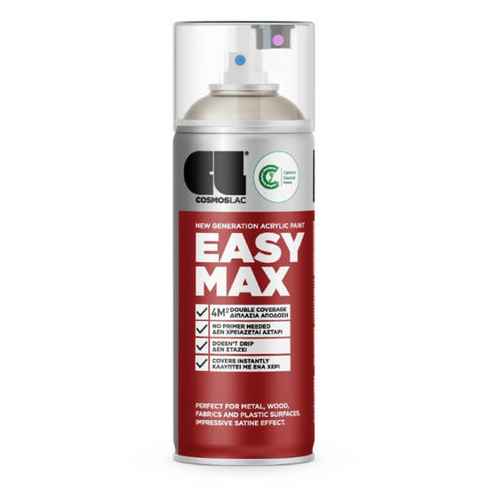 Спрей за боядисване EASY MAX на COSMOS е акрилна боя, създадена по иновативна технология Easymax - 4 пъти повече пигменти, което осигурява на EASY MAX покриване от 2 до 4 кв.м. площ с един флакон 400мл на „една ръка” без да е необходимо предварително грундиране на повърхността.