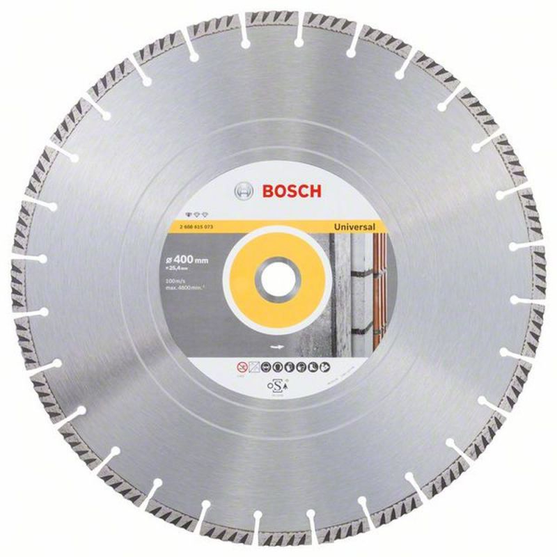 Дииамантен диск Standard 400 х 25.4мм за тухли и бетон на марката BOSCH. Стандартът за универсален диамантен диск за рязане позволява надеждно рязане на общи строителни материали. Неговата оптимизирана диамантена матрица гарантира надеждни резултати с високия си стандарт за качество. Центърът за компетенции на BOSCH за диаманти в Швейцария гарантира този стандарт, като непрекъснато осигурява постоянно качество. Дискът е подходящ за рязане на бетон и зидария.