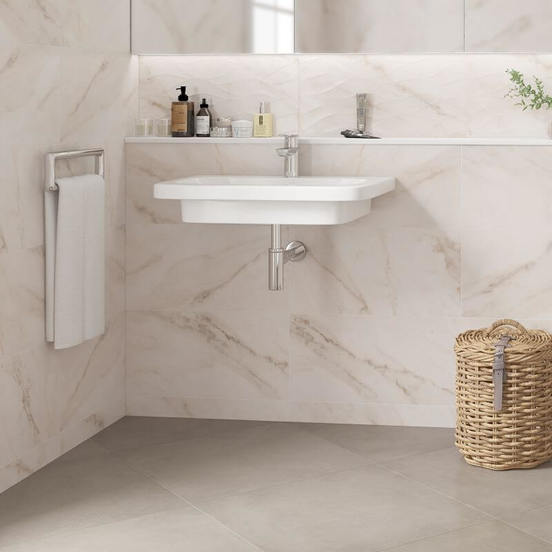 Гранитогрес, имитация на мрамор от серия Парос на марката CERAMICA FIORE. Плочките са с размер 45 х 45см, дебелина 8мм и цвят бежов. Повърхността им е матирана. В един кашон се съдържат 6 броя плочки с обща покривна площ 1.22 кв.м.