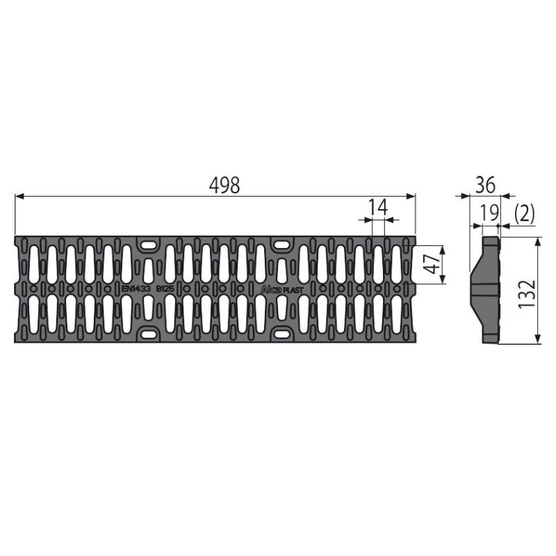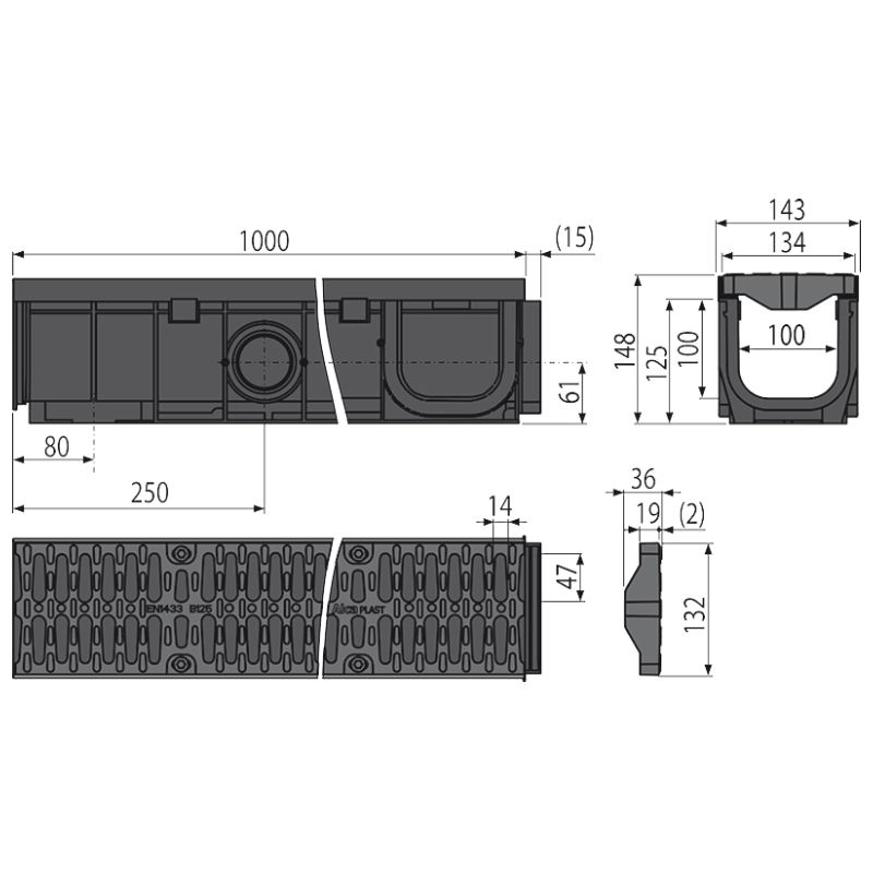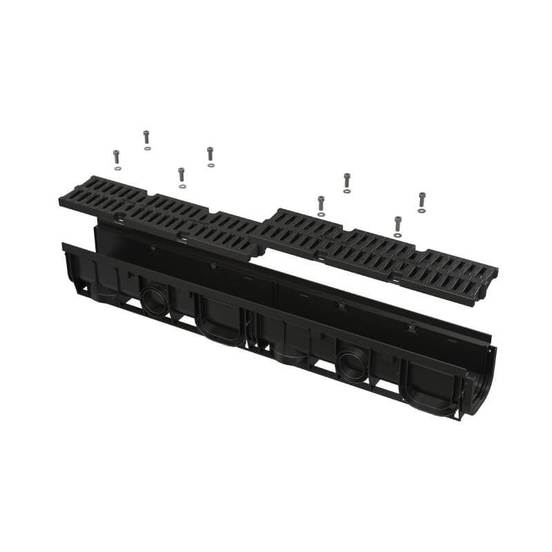 Външен отводняващ канал с широчина 100 мм, дължина 100 см и пластмасова композитна решетка. Улеят за отводняване е с клас на натоварване B125 с товароносимост до 12.5т. Подходящ е за инсталиране на тротоари, пешеходни зони, както и в паркинги за леки автомобили.