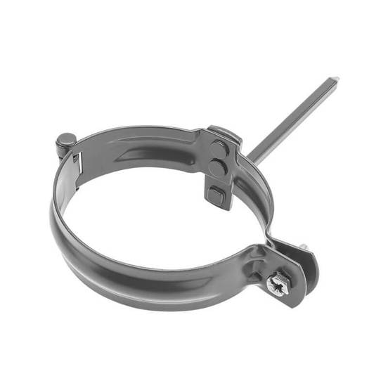 Скоба с пирон с дължина 150мм, подходяща за монтаж на водосточна тръба с диаметър Ф100мм. Скобата за водосточни тръби е незаменим аксесоар за монтаж на отводнителната система за покриви на K&J&G.