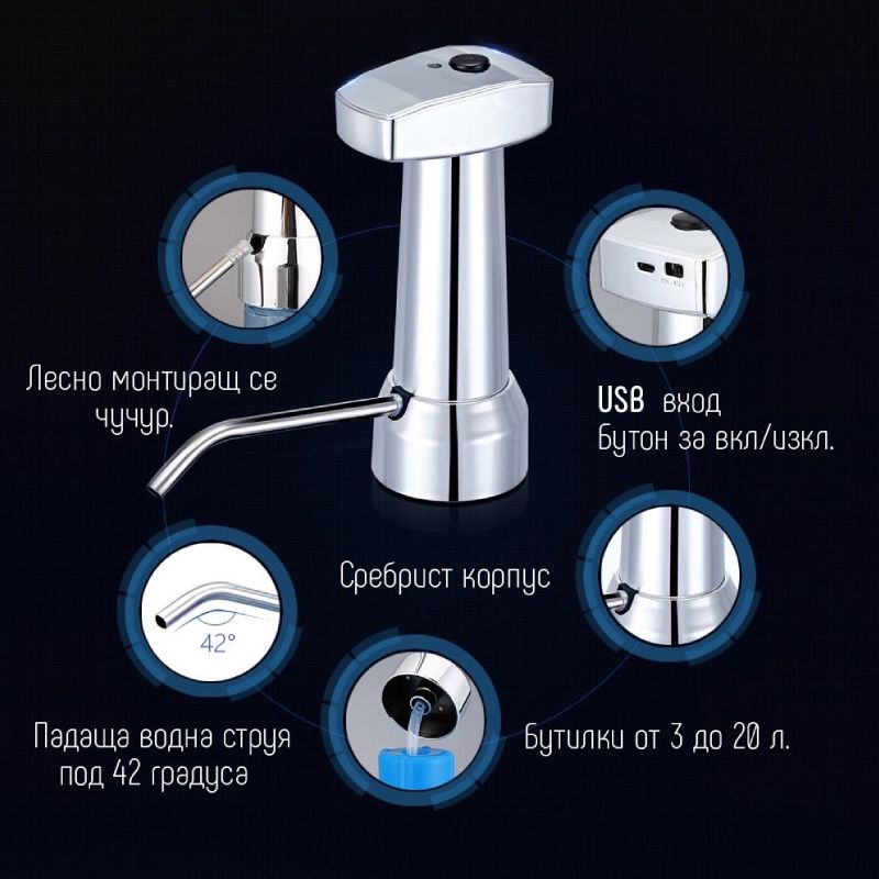 Преносима, лесна за употреба електрическа помпа за вода с USB зареждане. Помпата за вода е подходяща за използване с пластмасови бутилки от 3, 5, 8, 10 и 20 литра. Изходната тръба е произведена от висококачествена неръждаема стомана. Разполага със защита от деца и индикатор за зареждане.