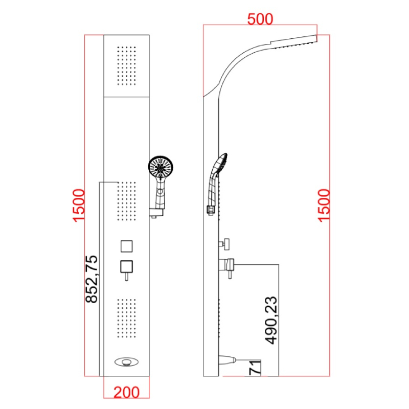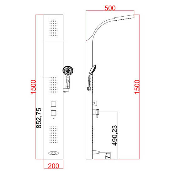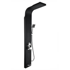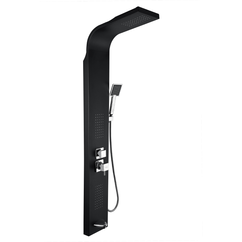 Хидромасажен душ панел Swan RSSDP01 в черен цвят. Корпусът на душ панела е произведен от алуминий, а всички останали елементи (ръчният душ, превключвателя и ръкохватката) от висококачествена ABS пластмаса.