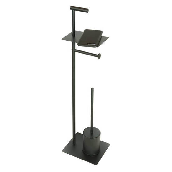 Свободно стоящ комплект за баня включващ четка за тоалетна чиния, държач за тоалетна хартия и масичка. Всички елементи от комплекта са произведени от неръждаема стомана и са боядисани в цвят черен мат.