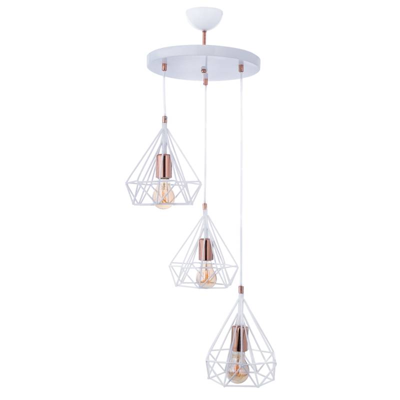 Метален пендел PIRAMIT 10103 WHITE/COPPER в цвят бял и мед. Осветителното тяло разполага с три фасунги Е27. С красив винтидж стил пенделът е подходящ за хол, спалня, всекидневна или офис. Височината му може да се регулира според желаните нужди и стил. Висящото осветително тяло е съвместимо с LED, енергоспестяващи и обикновени крушки.
