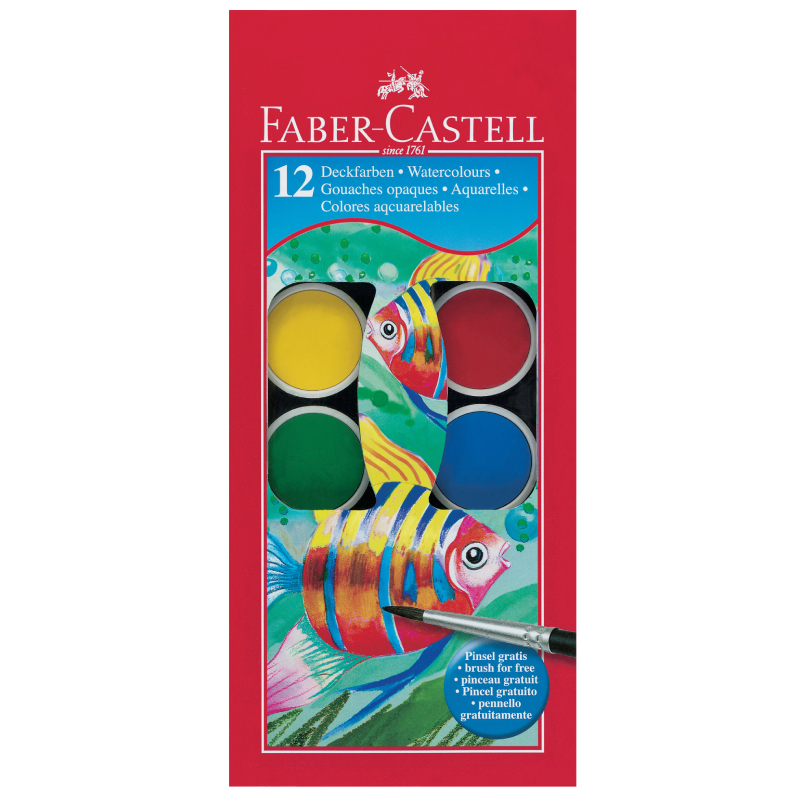 Акварелните бои на FABER CASTELL са добре познатите на всички класически бои с високо качество и отлична покривност на ярките цветовете. Цветовете могат да се смесват и да се образуват разнообразни нюанси и нови тонове. Нанасят се върху хартия и картон. Комплектът съдържа 12 различни цвята, като размерът на всяка таблетка с акварелна боя е 30 мм. Предлагат се в здрава и надеждна кутия с подарък четка за рисуване.
