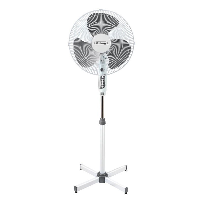 Вентилатор на стойка R51760A на марката ROSBERG. Уредът е с мощност 45 W и диаметър 40 см. Може да работи на 3 скорости: слабо, средно, силно. Бял, със сиви перки.