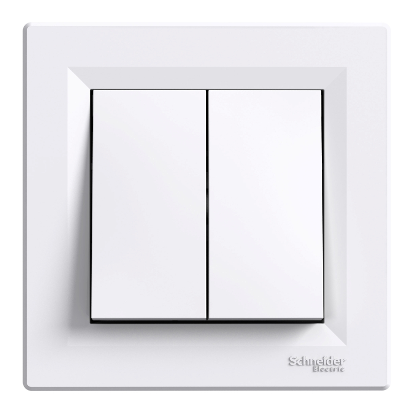 Двоен девиаторен ключ за осветление от серията Asfora на марката SCHNEIDER ELECTRIC. Изработен от ABS (акрилонитрил бутадиен-стирен) в цвят бял. Отличава се с модерен дизайн и квадратна форма с размери 83 х 83мм. Номинален ток: 10А.