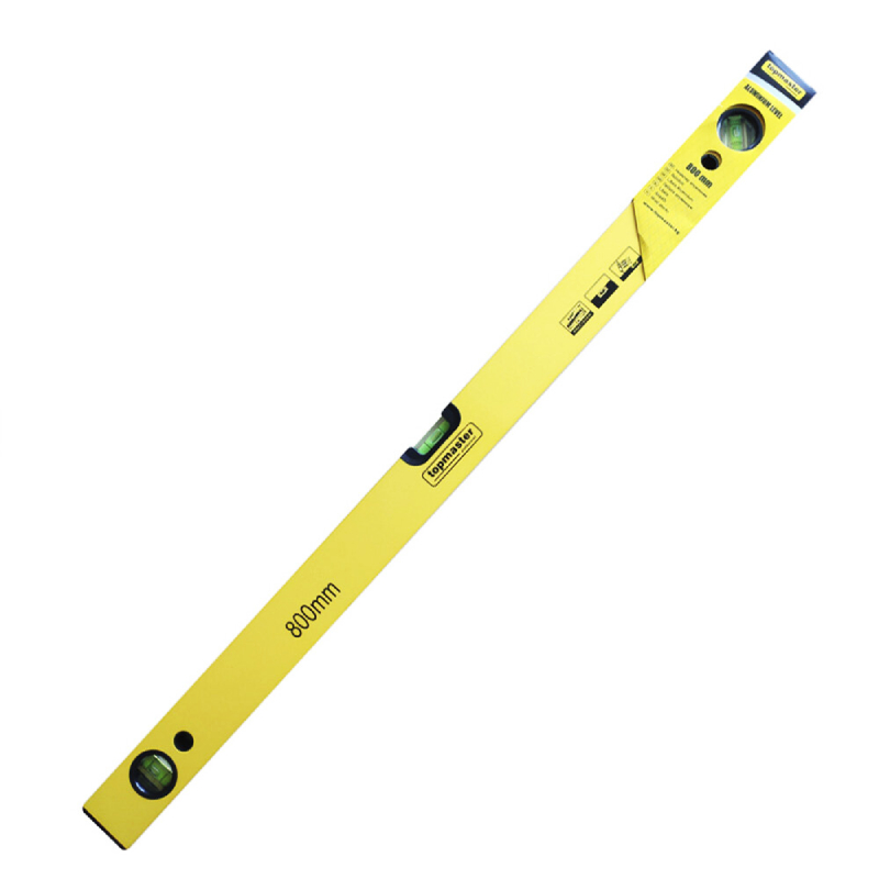 Висококачествен професионален алуминиев нивелир TOPMASTER с дължина 800 мм. Нивелирът дава точност на измерване до 1 мм/м. Изработен е от висококачествени и леки материали за удобство при пренасяне и работа. В двата си края е снабден с гумени накрайници, абсорбиращи удар. Този модел нивелир разполага с 3 либели за измерване и отвор за закачане на стена.