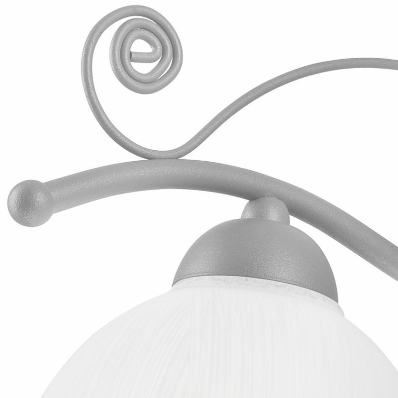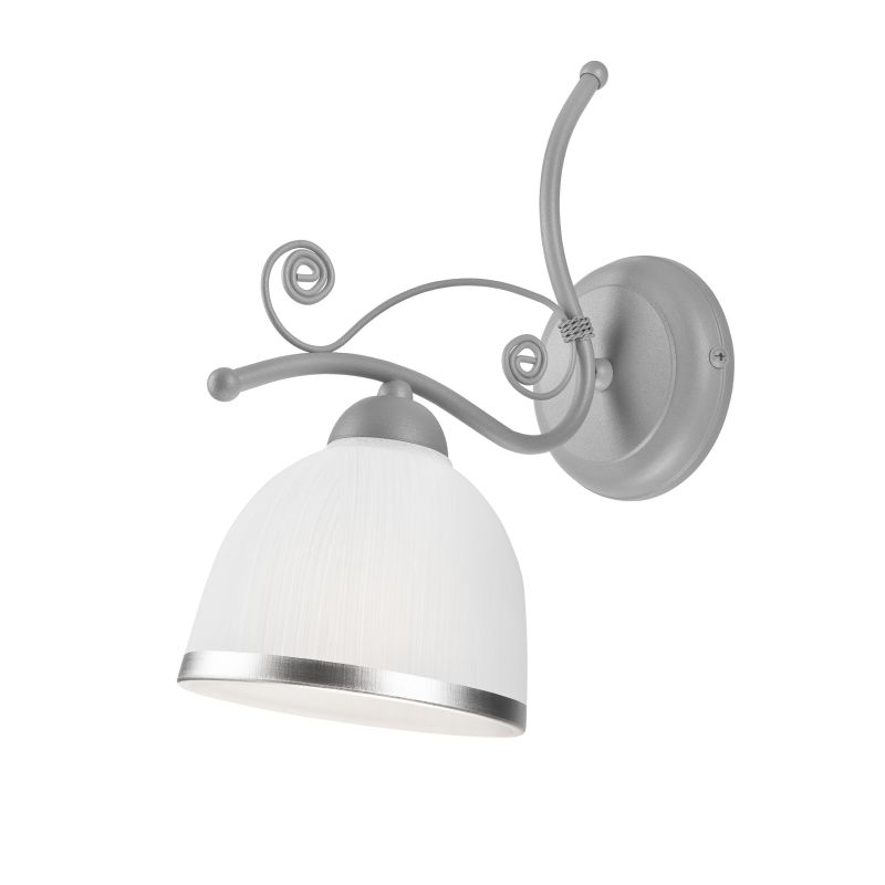 Метален аплик RETRO в цвят сребро. Осветителното тяло разполага с една фасунга Е27. Със своя модерен дизайн, апликът е подходящо осветление за спалня, всекидневна, коридор или антре. Абажурът е от стъкло бял мат с декоративни ивици. Стъклената осветяваща част е завършена с нежен кант в цвят сребро сатен. Апликът е съвместимо с LED, енергоспестяващи и обикновени крушки.