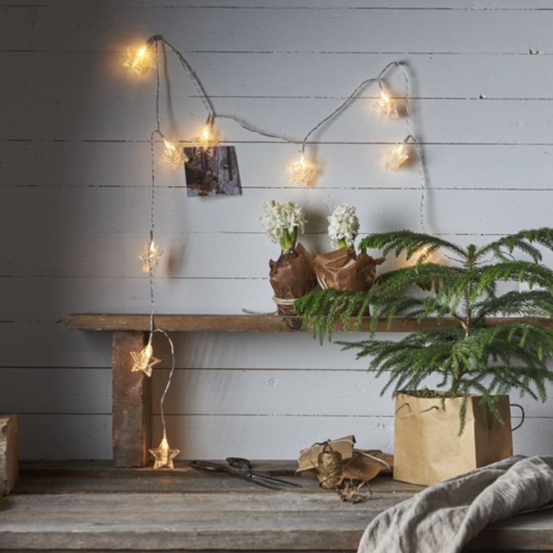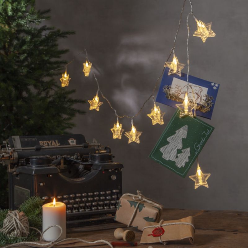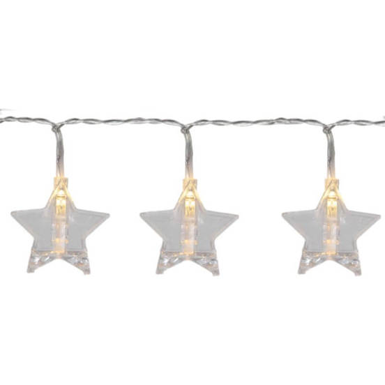 Светеща верига – кабел с 10 броя LED лампички във формата на коледни звезди за декорация на дома. Лампичките са най-предпочитани за поставяне на мебелите у дома, коледната трапеза и коледното дърво. Захранващият кабел е с дължина 30 см. Лампичките се захранват с три броя батерии тип AA. Захранващото устройство разполага с вграден таймер, който позволява настройка за автоматично изключване на лампичките.