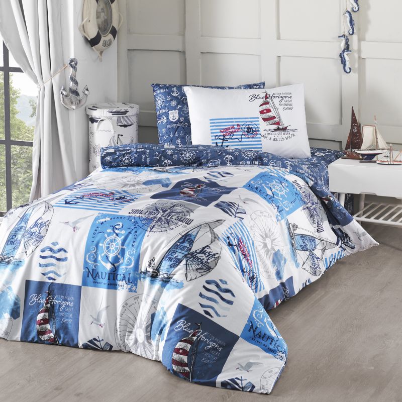 Спален комплект Sail в 3 части. Изработен от висококачествен плат - 100% памук ранфорс. Спалното бельо се състои от чаршаф, плик за завивка и калъфка за възглавница. Частите са в щампиран десен.