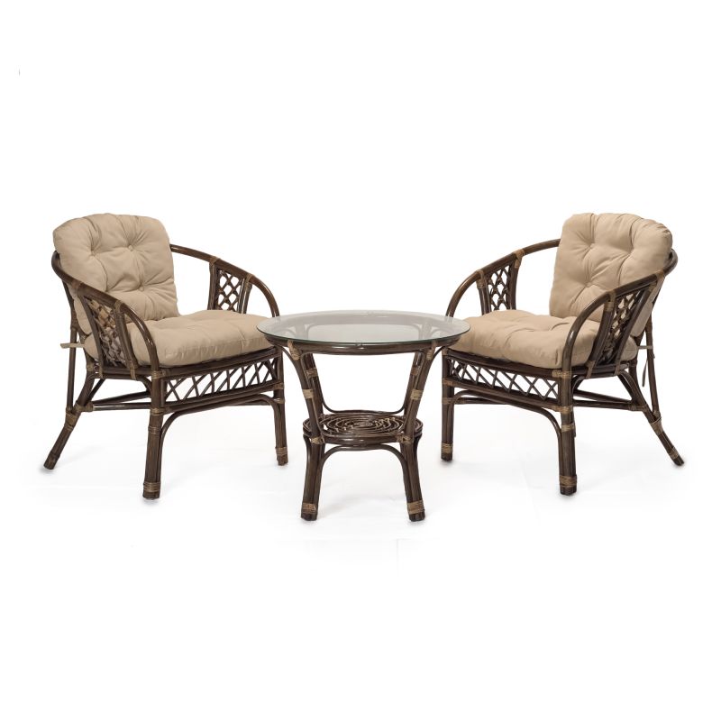Красив и удобен градински комплект мебели Arcadia, състоящ се от три части – 2 стола и маса. Комплектът градински столове с маса e изработен от естествен ратан в цвят орех и се предлага в комплект с меки възглавници.