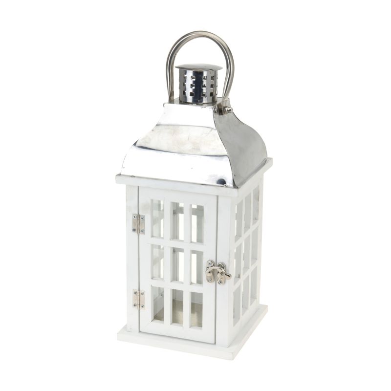 Декоративен фенер за декорация на интериор или екстериор от всеки тип. Фенерът е изработен от дърво и е с размери 17х17х39 см. Предлага се в бял цвят.