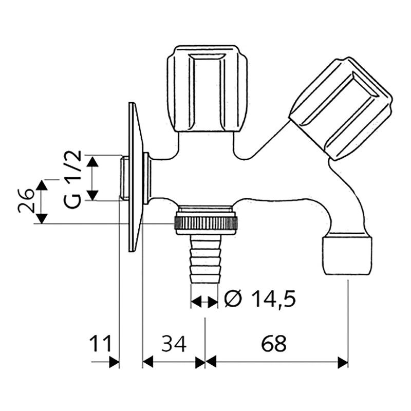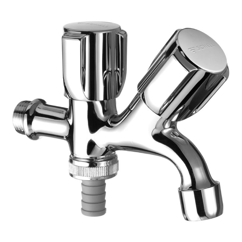 Канелка SCHELL Comfort с щуцер за връзка с маркуч. Присъединителният размер на канелката е G1/2“, а размерът на щуцерът е 3/4“. Ръкохватките на канелката с щуцер се движат изключително лесно и гладко, благодарение на интегрираната грес камера.