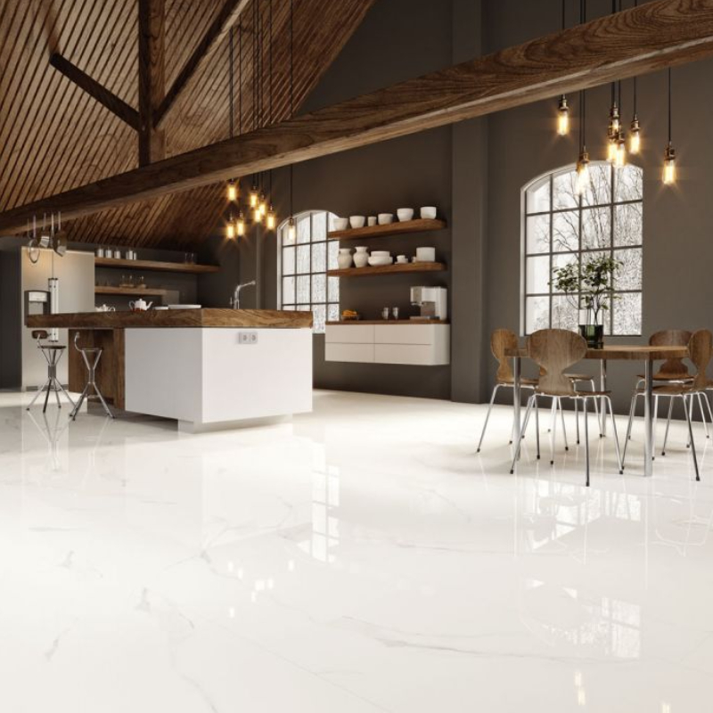 Гранитогрес Статуарио е подходящ както за подове, така и за стени. Дизайнът на плочките имитира мрамор с гладка, полирана повърхност.