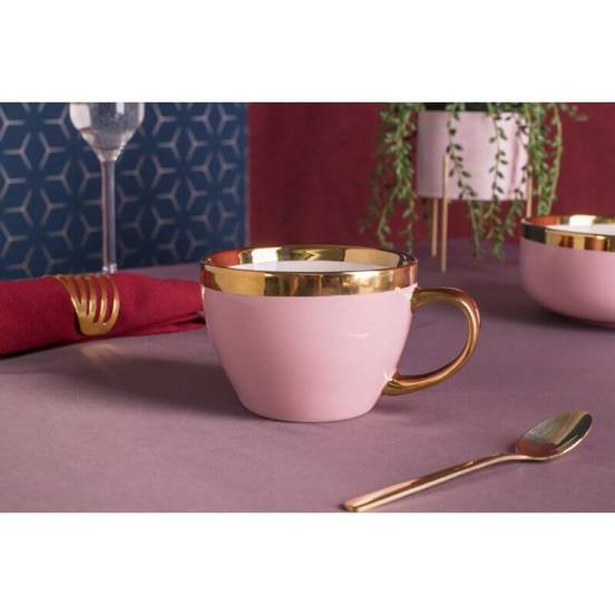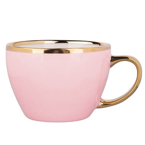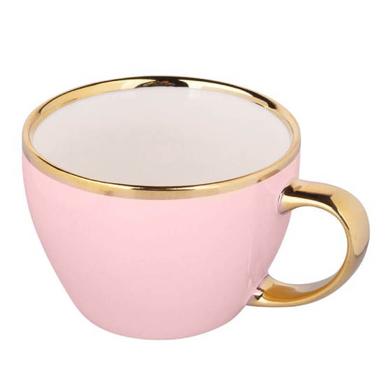Порцеланова чаша за сервиране на всякакъв вид горещи напитки. Чашата е декорирана със златен кант и златна дръжка, които не позволяват поставянето й в микровълнова фурна, както и миенето в съдомиялна машина.