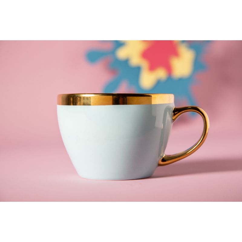 Порцеланова чаша за сервиране на всякакъв вид горещи напитки. Чашата е декорирана със златен кант и златна дръжка, които не позволяват поставянето й в микровълнова фурна, както и миенето в съдомиялна машина.