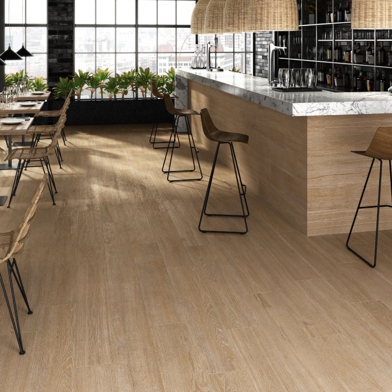 Гранитогрес от серия Файър Ууд Ногал на марката EMIGRES. Плочките са с размер 20 х 120 см и дебелина около 10 мм. Имат матова повърхност и имитират дърво. В един кашон се съдържат 5 броя плочки с покривна площ 1.16 кв.м.