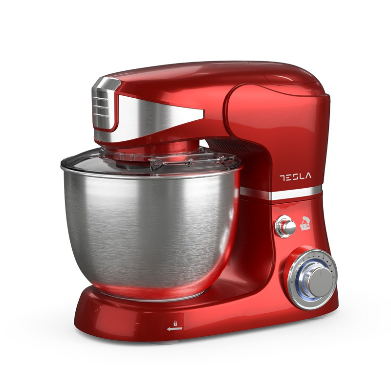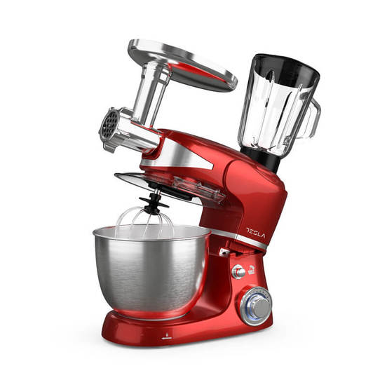 Кухненски робот KR600RA на марката TESLA. Уредът е с мощност 1000 W и купа с вместимост 5 л. Притежава функции месене, мелене и блендер.